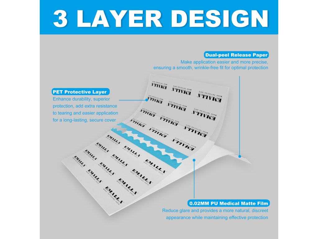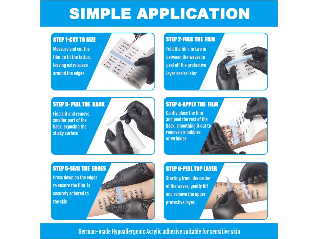 Nesterilní fólie pro hojení tetování. Udržuje tetování v bezpečí před infekcí z vnějšku. Díky své průhlednosti poskytuje transparentní ochranu.